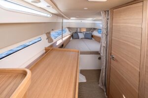 The cockpit of the W11, similar to the W9, offers superior protection with a large window screen and seating for three. The standard open boat is equipped with a targa, but an optional large electric sun-top similar to that of the T11 can also be added.