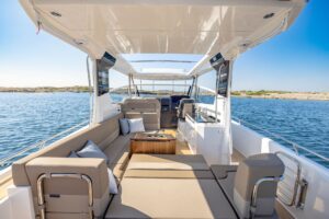 The interior layout and multifunctional seating arrangements are specially designed for social activities and entertaining. The multiple large social areas are perfect for hanging out with friends or family, relaxing, taking a swim or soaking up the sun on either the fore deck or on the aft deck. The W11 also includes new features such as folding side balconies for added space and flexibility when anchored and an optional hydraulic swim platform that extends aft of the engines so you guests on board can be closer to the water.